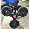Podvozek vybavený 6 kolečky menší velikosti byl navržen pro snadné stoupání do schodů, kdy jsou využita všechna kolečka. Při provozu na rovném povrchu jsou do jízdy zapojena čtyři kolečka, která zajistí, že se hmotnost celého nákladu rovnoměrně rozloží do celého podvozku a nezatíží tak vaše záda. Podvozek je vybaven přední oporou, která umožňuje tašku stabilně odstavit volně do prostoru. Zároveň ji lze jedním pohybem sklopit. Stisknutím červených bodů jednoduše sundáte kolečka a dosáhnete tak dokonale plochého tvaru pro snadné uložení.