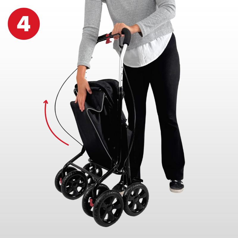 Nákupní vozík Kadira LN nabízí nastavitelnou rukojeť, kterou si lze snadno přizpůsobit do ideální výšky pomocí svorky ve tvaru C. Vzhledem k podpůrné funkci vozíku, jsou zadní kola vybavena spolehlivým brzdovým systémem s parkovací funkcí – jednoduchým pohybem páky lze vozík bezpečně zajistit při zastavení a při používání sedátka.